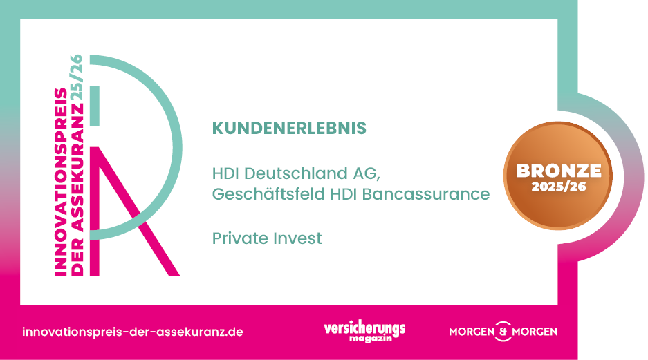 Wir freuen uns, heute die HDI AG mit Bronze in der Kategorie Kundenerlebnis auszuzeichnen. Mit "Private Invest“ verbindet HDI die Vorteile einer Fondspolice mit der Flexibilität eines Depots. Taggleiches Handeln, eine große Auswahl an Investment- und ESG-Fonds sowie einfaches Onboarding ermöglichen schnelle Entscheidungen und maximale Transparenz – ein modernes Anlageerlebnis.